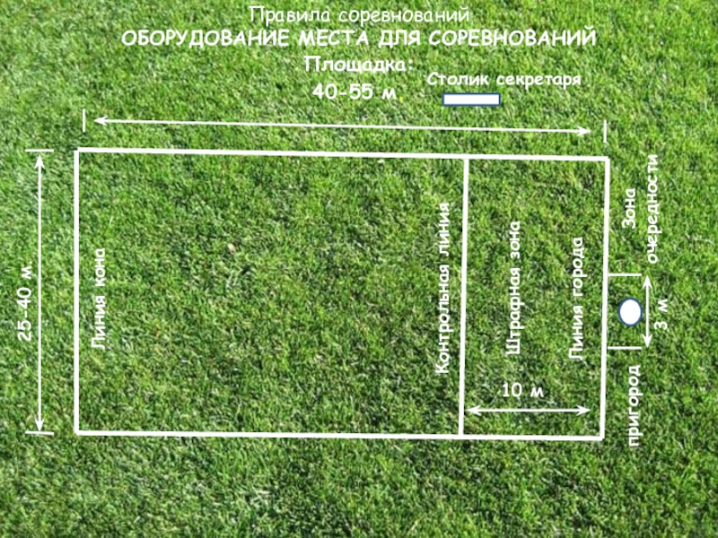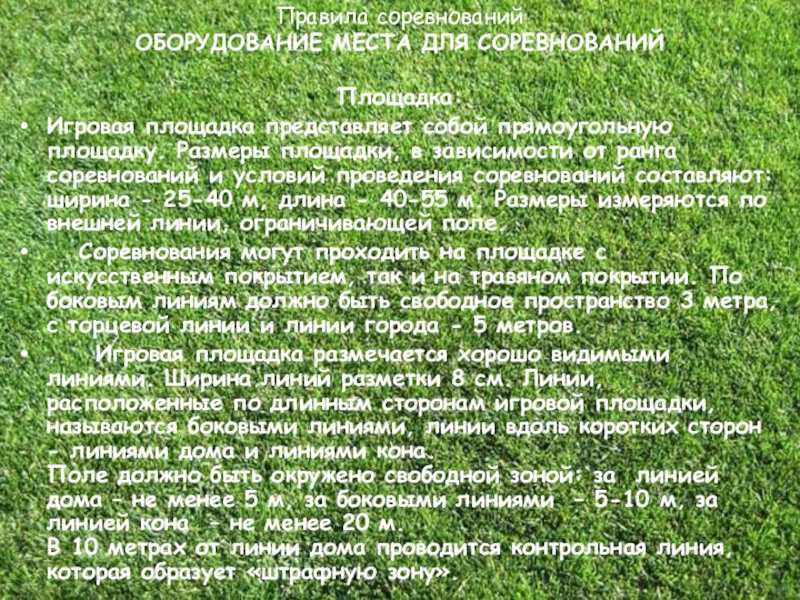 площадки, в зависимости от ранга соревнований и условий проведения соревнований составляют: ширина - 25-40 м, длина - 40-55 м. Размеры измеряются по внешней линии, ограничивающей поле.