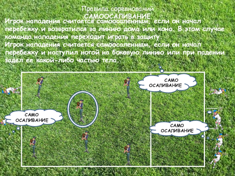 Игрок нападения считается самоосаленным, если он начал перебежку и наступил ногой на боковую линию или при падении задел ее какой-либо частью тела.