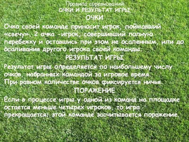 2 очка -игрок, совершивший полную перебежку и оставшись при этом не осаленным, или до осаливания другого игрока своей команды.