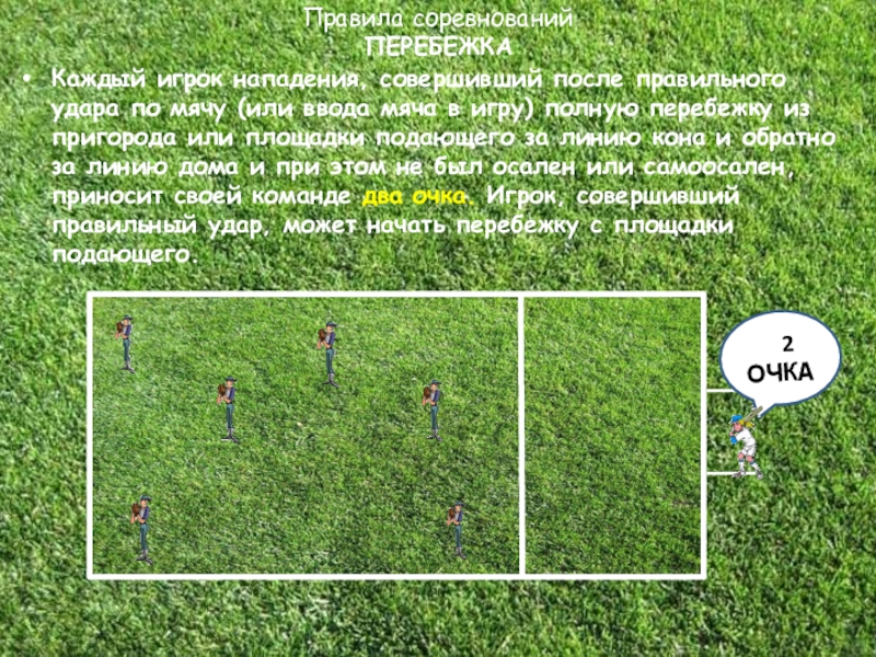 ввода мяча в игру) полную перебежку из пригорода или площадки подающего за линию кона и обратно за линию дома и при этом не был осален или самоосален, приносит своей команде два очка. Игрок, совершивший правильный удар, может начать перебежку с площадки подающего.