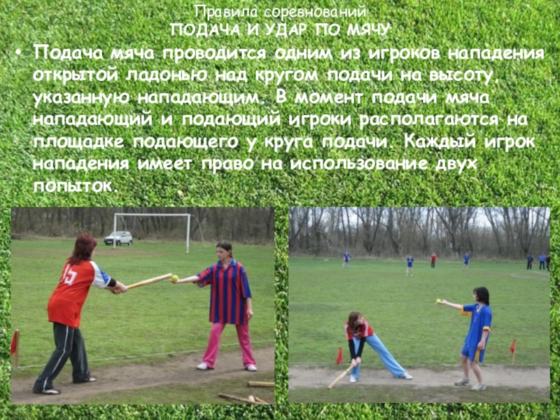 Игроки команды, начинающей по жребию игру в защите, занимают исходные позиции на игровой площадке, а первый номер нападающей команды становится с битой на площадку подающего у круга подачи. Остальные игроки находятся на скамейках своих команд. Подачу мяча осуществляет игрок нападения (без права на перебежку). Игрок-подающий мяч становится у круга подачи.