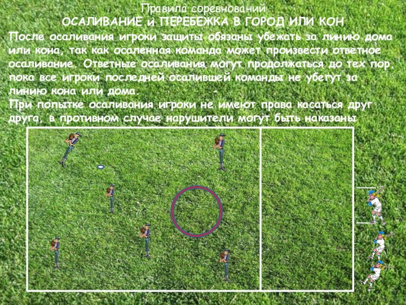 обязаны убежать за линию дома или кона, так как осаленная команда может произвести ответное осаливание. Ответные осаливания могут продолжаться до тех пор, пока все игроки последней осалившей команды не убегут за линию кона или дома.