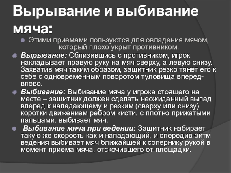 Выбивание мяча при ведении: Защитник набирает такую же скорость как и нападающий, и опередив ритм ведения выбивает мяч ближайшей к сопернику рукой в момент приема мяча, отскочившего от площадки.