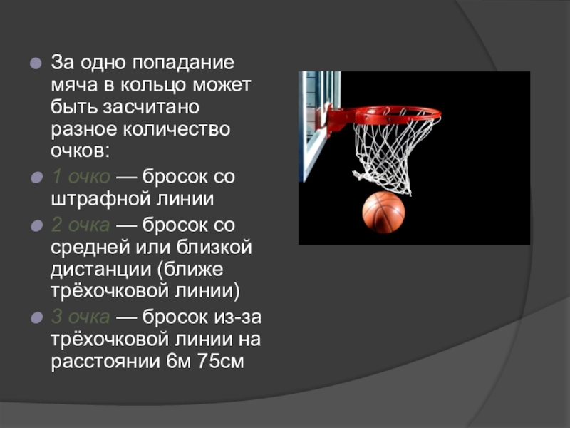 Слайд 10За одно попадание мяча в кольцо может быть засчитано разное количество