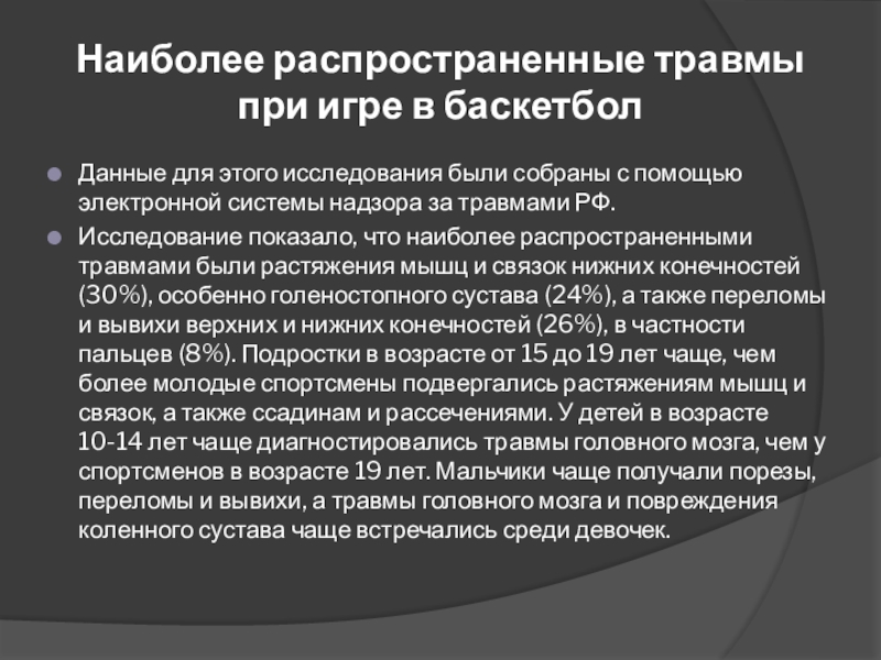 Слайд 28Наиболее распространенные травмы при игре в баскетбол
