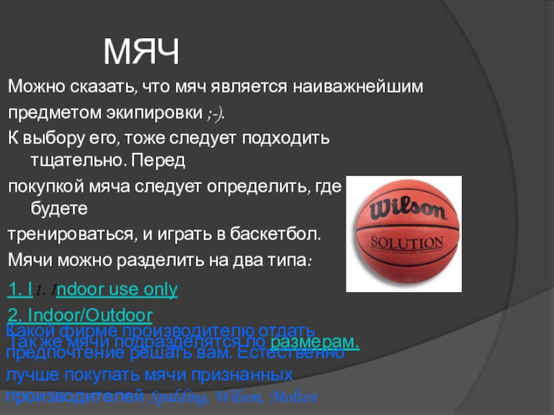 Какой фирме производителю отдать предпочтение решать вам. Естественно лучше покупать мячи признанных производителей Spalding, Wilson, Molten