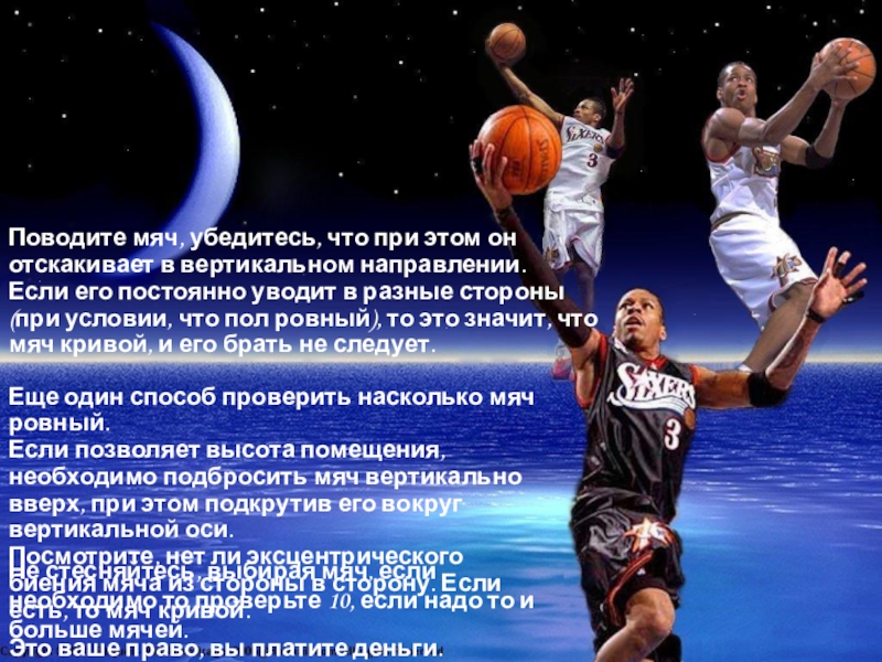его постоянно уводит в разные стороны (при условии, что пол ровный), то это значит, что мяч кривой, и его брать не следует.