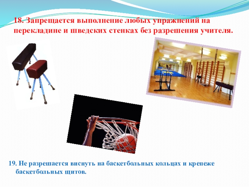 19. Не разрешается виснуть на баскетбольных кольцах и крепеже баскетбольных щитов.