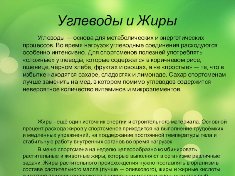 время нагрузок углеводные соединения расходуются особенно интенсивно. Для спортсменов полезней употреблять «сложные» углеводы, которые содержатся в коричневом рисе, пшенице, чёрном хлебе, фруктах и овощах, а не «простые» — те, что в избытке находятся сахаре, сладостях и лимонаде. Сахар спортсменам лучше заменить на мед, в котором помимо углеводов содержится невероятное количество витаминов и микроэлементов.