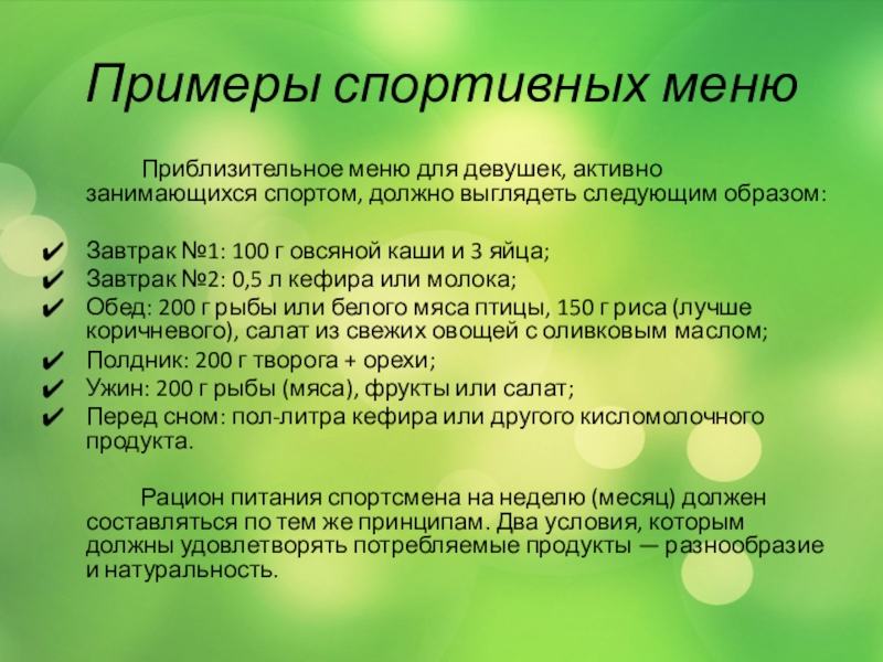 Приблизительное меню для девушек, активно занимающихся спортом, должно выглядеть