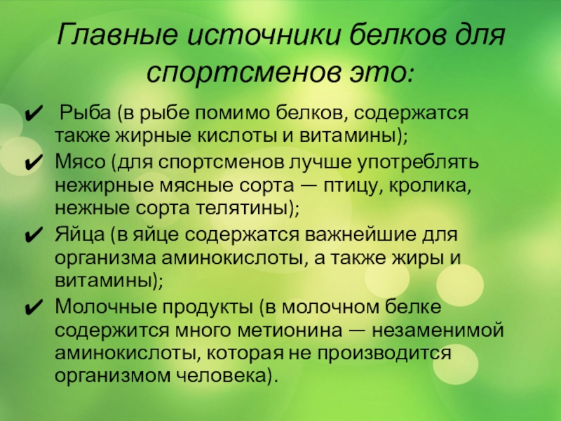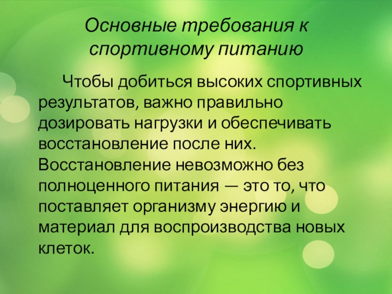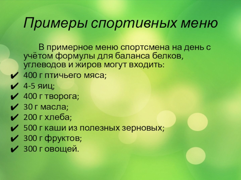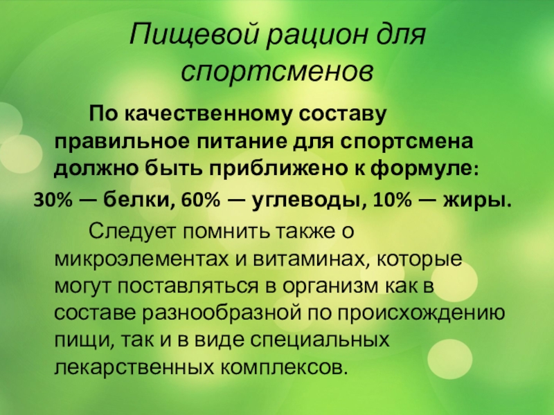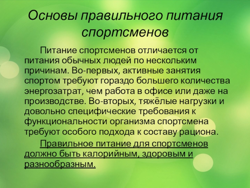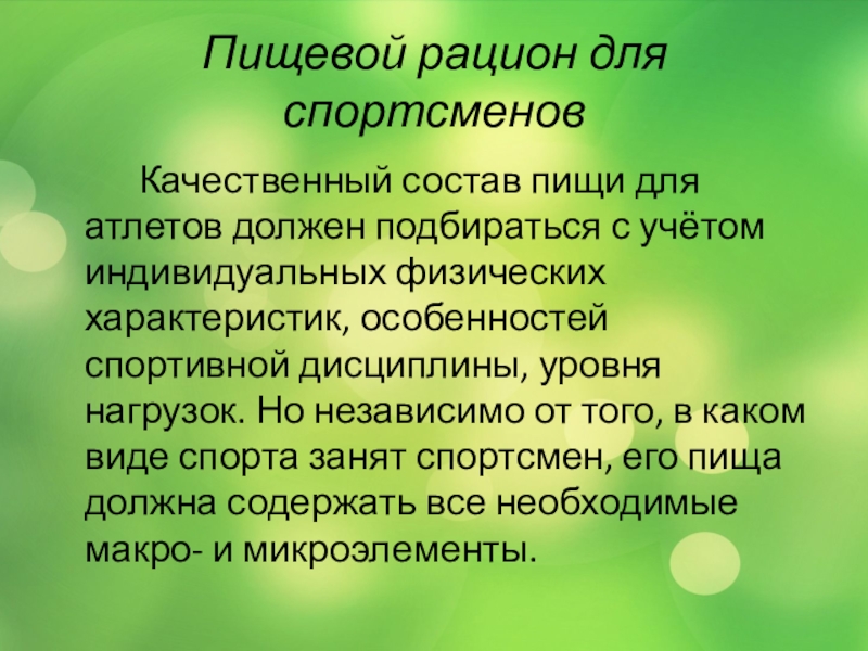 учётом индивидуальных физических характеристик, особенностей спортивной дисциплины, уровня нагрузок. Но независимо от того, в каком виде спорта занят спортсмен, его пища должна содержать все необходимые макро- и микроэлементы.