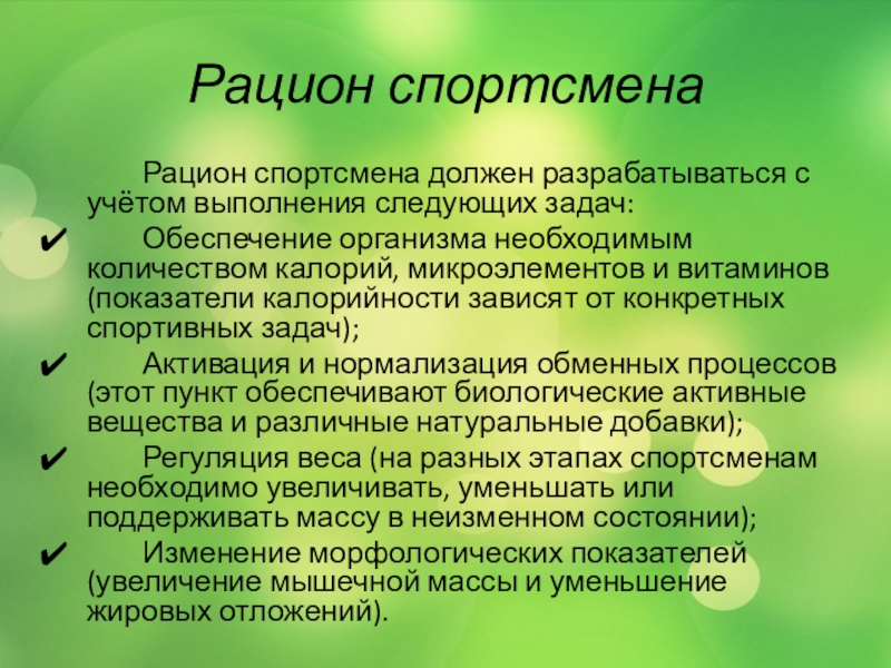 Рацион спортсмена должен разрабатываться с учётом выполнения следующих задач: