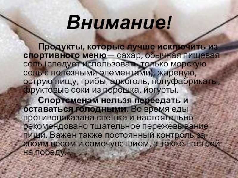 Продукты, которые лучше исключить из спортивного меню— сахар, обычная пищевая соль