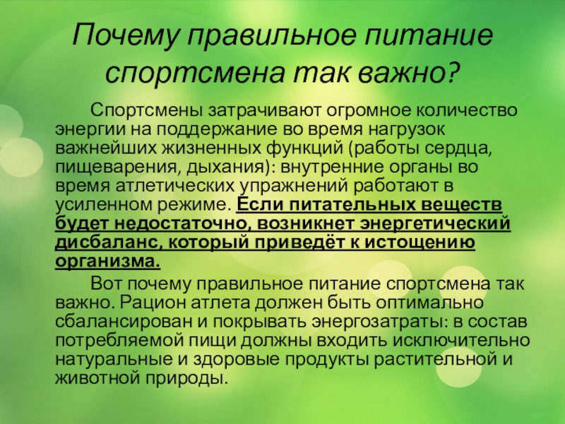 нескольким причинам. Во-первых, активные занятия спортом требуют гораздо большего количества энергозатрат, чем работа в офисе или даже на производстве. Во-вторых, тяжёлые нагрузки и довольно специфические требования к функциональности организма спортсмена требуют особого подхода к составу рациона.