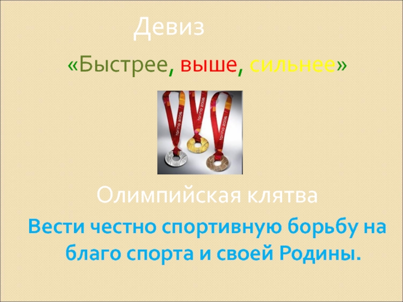 Девиз«Быстрее, выше, сильнее»Олимпийская клятваВести честно спортивную борьбу на благо спорта и своей Родины.