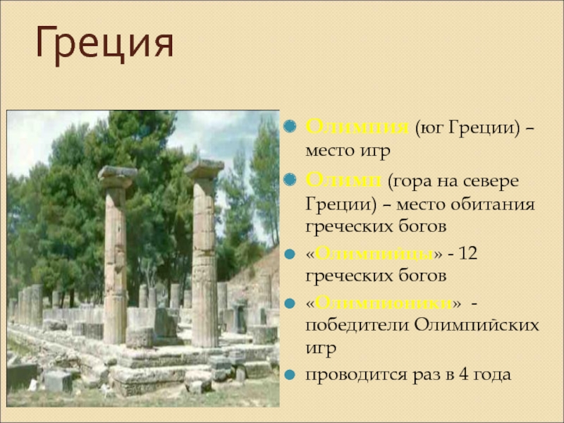 ГрецияОлимпия (юг Греции) – место игрОлимп (гора на севере Греции) – место обитания греческих богов«Олимпийцы» - 12