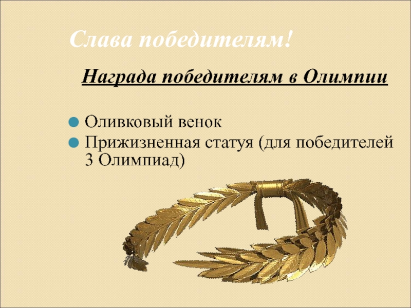 Слава победителям!Награда победителям в Олимпии Оливковый венокПрижизненная статуя (для победителей 3 Олимпиад)