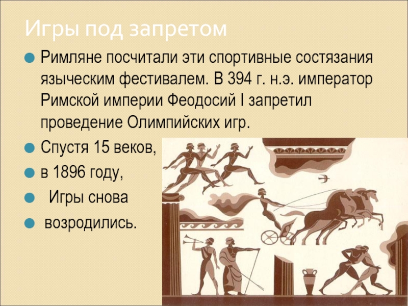 Игры под запретомРимляне посчитали эти спортивные состязания языческим фестивалем. В 394 г. н.э. император Римской империи Феодосий