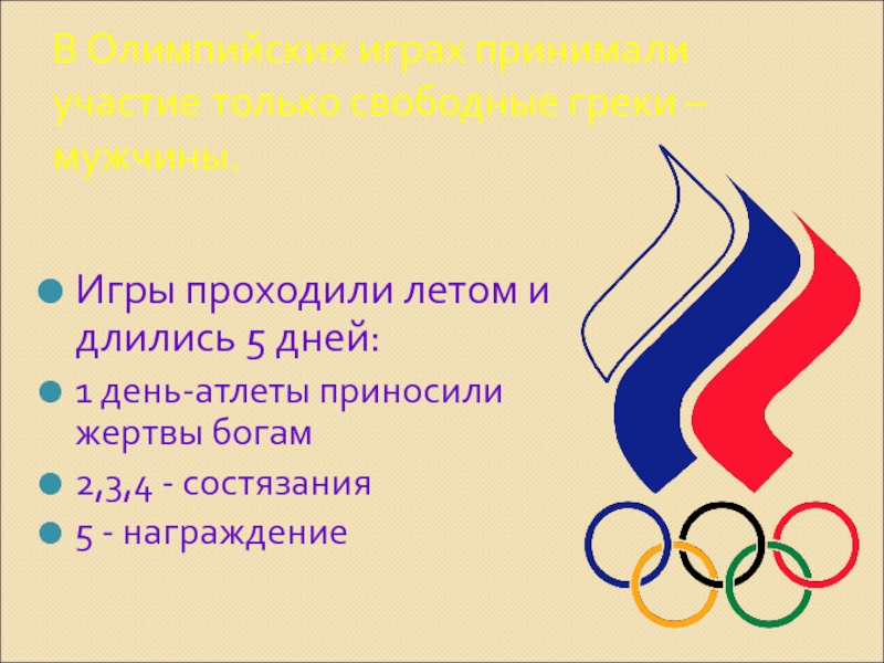 В Олимпийских играх принимали участие только свободные греки – мужчины.Игры проходили летом и длились 5 дней:1 день-атлеты