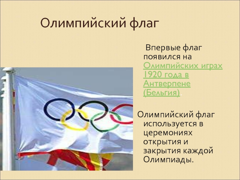 Олимпийский флаг	Впервые флаг появился на Олимпийских играх 1920 года в Антверпене (Бельгия). Олимпийский флаг используется в церемониях