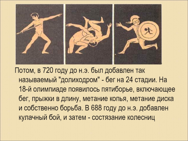 "долиходром" - бег на 24 стадии. На 18-й олимпиаде появилось пятиборье, включающее бег, прыжки в длину, метание копья, метание диска и собственно борьба. В 688 году до н.э. добавлен кулачный бой, и затем - состязание колесниц