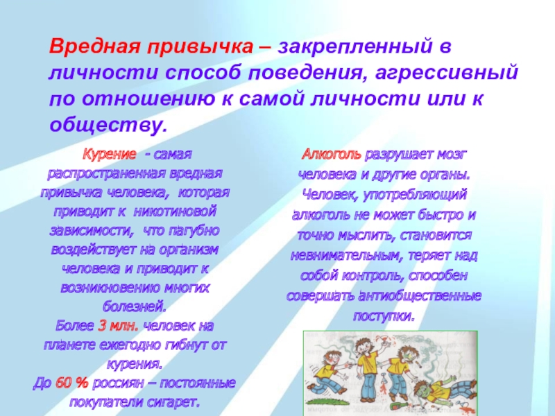 Курение - самая распространенная вредная привычка человека, которая приводит к никотиновой зависимости, что пагубно воздействует на организм человека и приводит к возникновению многих болезней.