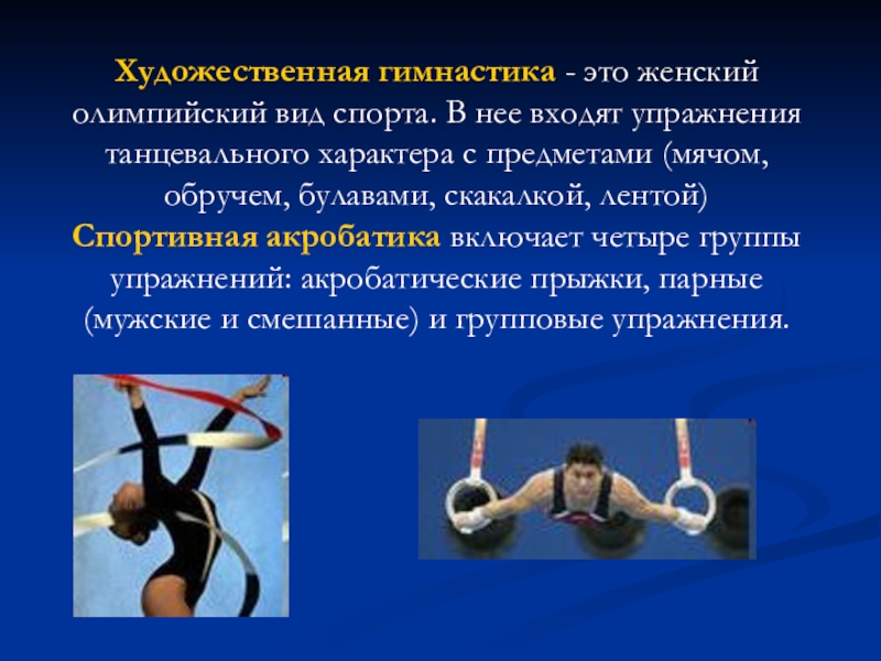 Слайд 7Художественная гимнастика - это женский олимпийский вид спорта. В нее входят