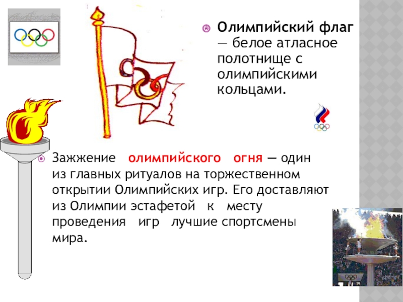на торжественном открытии Олимпийских игр. Его доставляют из Олимпии эстафетой к месту проведения игр лучшие спортсмены мира.