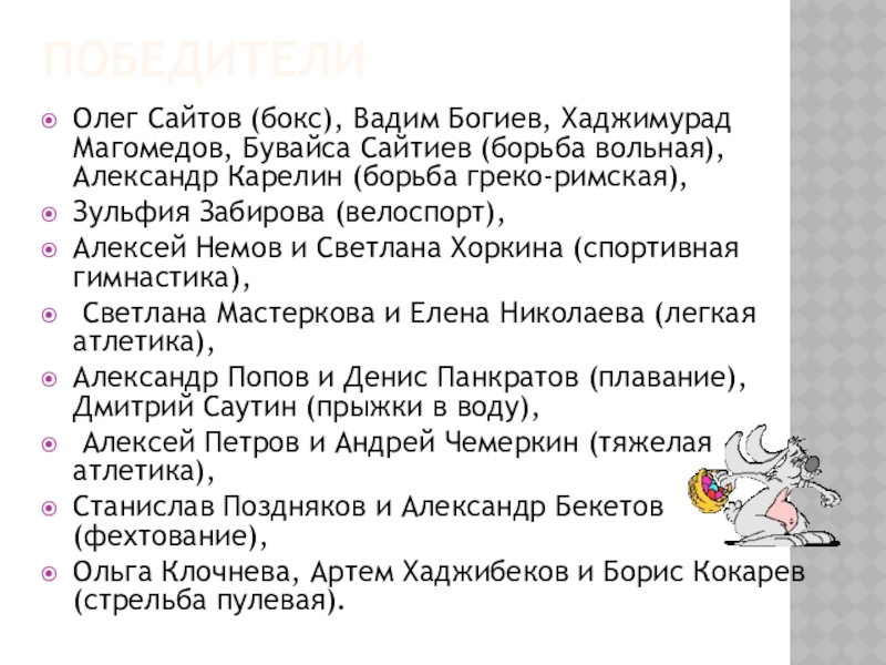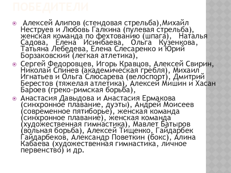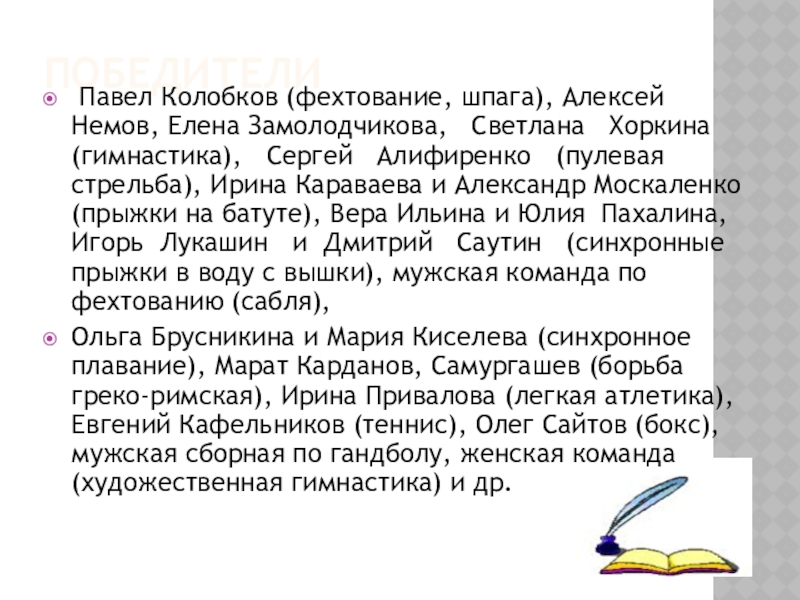 Ольга Брусникина и Мария Киселева (синхронное плавание), Марат Карданов, Самургашев (борьба греко-римская), Ирина Привалова (легкая атлетика), Евгений Кафельников (теннис), Олег Сайтов (бокс), мужская сборная по гандболу, женская команда (художественная гимнастика) и др.