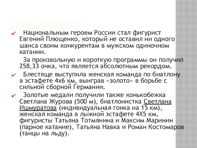 Золотые медали получили также конькобежка Светлана Журова (500 м), биатлонистка Светлана Ишмуратова (индивидуальная гонка на 15 км), женская команда в лыжной эстафете 4X5 км, фигуристы Татьяна Тотмянина и Максим Маринин (парное катание), Татьяна Навка и Роман Костомаров (танцы на льду).