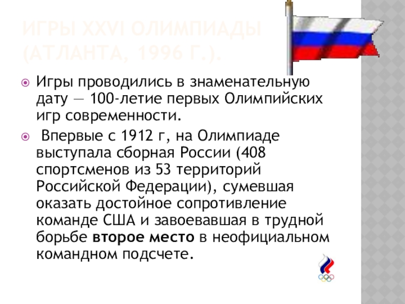 Слайд 12ИГРЫ XXVI ОЛИМПИАДЫ (АТЛАНТА, 1996 Г.).