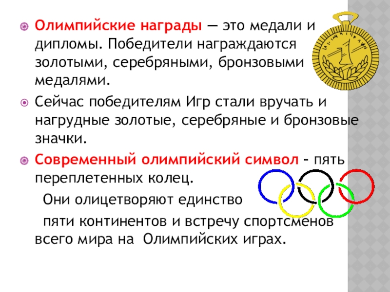Слайд 7Олимпийские награды — это медали и дипломы. Победители награждаются золотыми, серебряными,