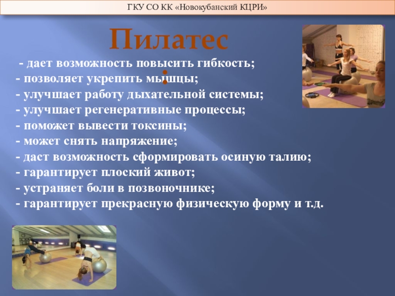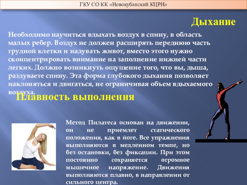Метод Пилатеса основан на движении, он не приемлет статического положения, как в йоге. Все упражнения выполняются в медленном темпе, но без остановки, без фиксации. При этом постоянно сохраняется огромное мышечное напряжение. Движения выполняются плавно, в направлении от сильного центра.