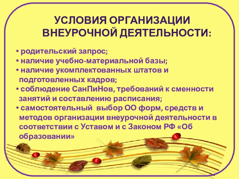 самостоятельный выбор ОО форм, средств и методов организации внеурочной деятельности в соответствии с Уставом и с Законом РФ «Об образовании»