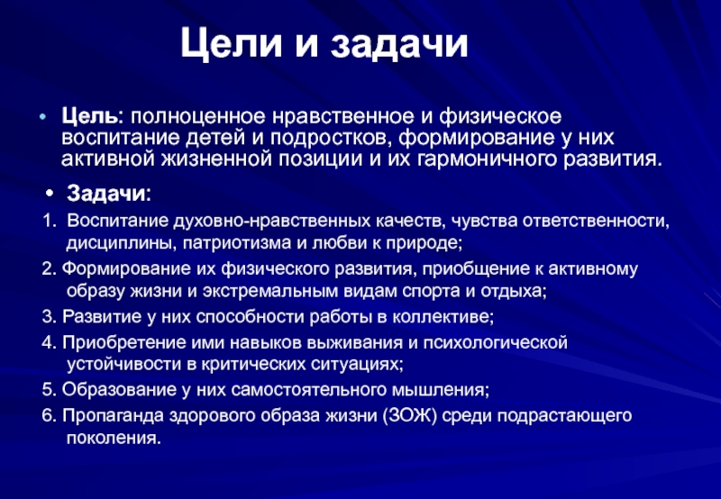 2. Формирование их физического развития, приобщение к активному образу жизни и экстремальным видам спорта и отдыха;