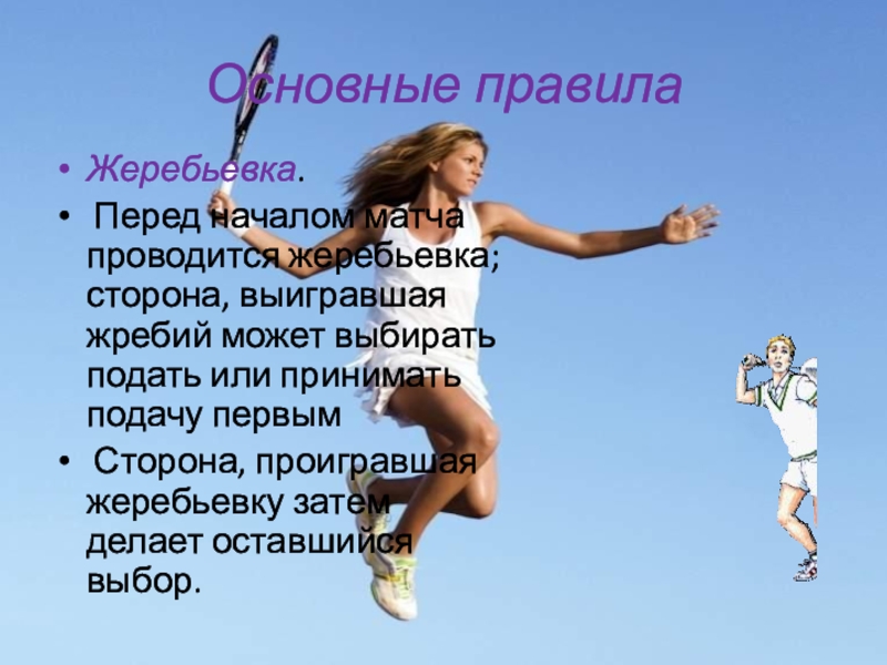 Основные правилаЖеребьевка. Перед началом матча проводится жеребьевка; сторона, выигравшая жребий может выбирать подать или принимать подачу первым