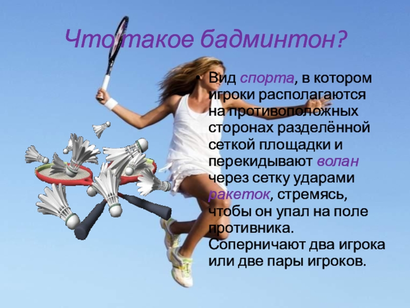Что такое бадминтон?Вид спорта, в котором игроки располагаются на противоположных сторонах разделённой сеткой площадки и перекидывают волан