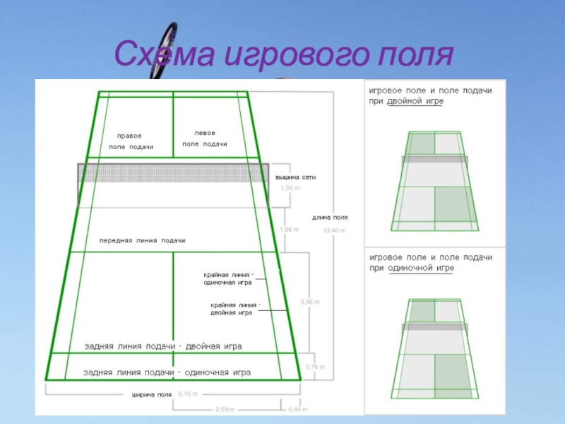 разделённой сеткой площадки и перекидывают волан через сетку ударами ракеток, стремясь, чтобы он упал на поле противника. Соперничают два игрока или две пары игроков.