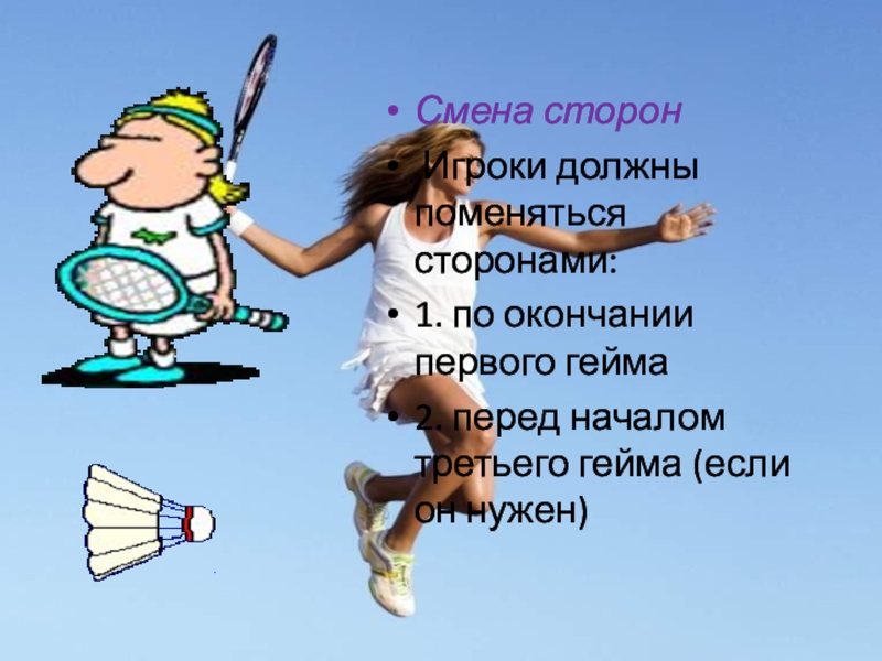 Смена сторон Игроки должны поменяться сторонами: 1. по окончании первого гейма 2. перед началом третьего гейма (если
