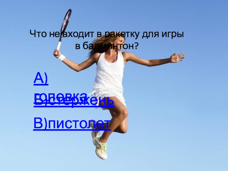 Что не входит в ракетку для игры в бадминтон?А)головкаБ)стерженьВ)пистолет