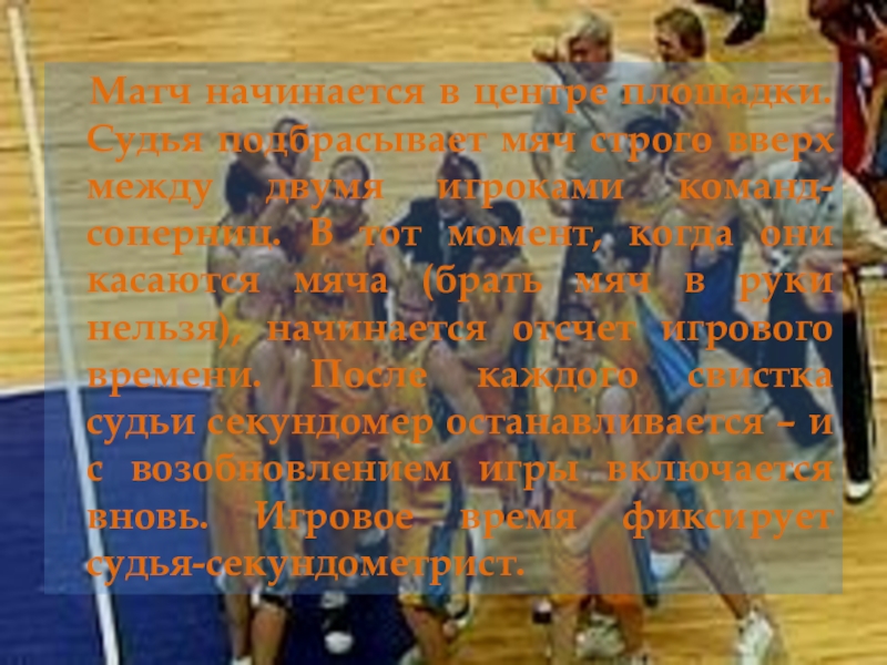 вверх между двумя игроками команд-соперниц. В тот момент, когда они касаются мяча (брать мяч в руки нельзя), начинается отсчет игрового времени. После каждого свистка судьи секундомер останавливается – и с возобновлением игры включается вновь. Игровое время фиксирует судья-секундометрист.