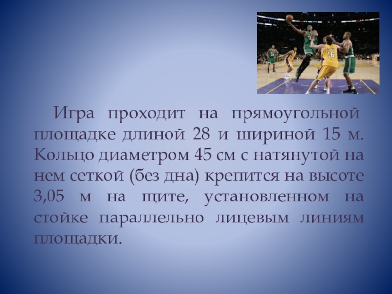 Слайд 5 Игра проходит на прямоугольной площадке длиной 28 и шириной