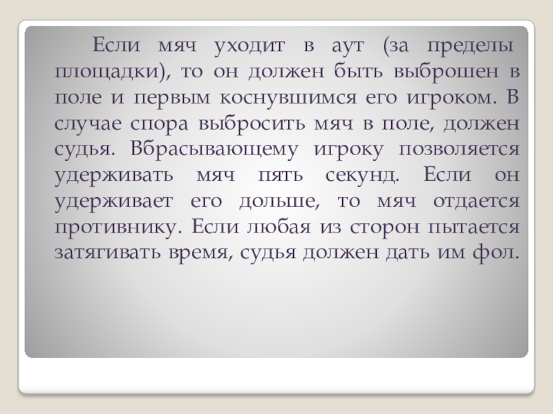 Слайд 10 Если мяч уходит в аут (за пределы площадки), то