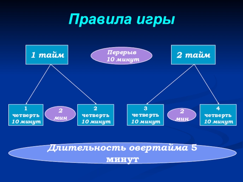 Правила игры 1 тайм2 тайм1 четверть10 минут2 четверть10 минут3 четверть10 минут4 четверть10 минут2 мин2 минПерерыв 10 минутДлительность овертайма 5 минут