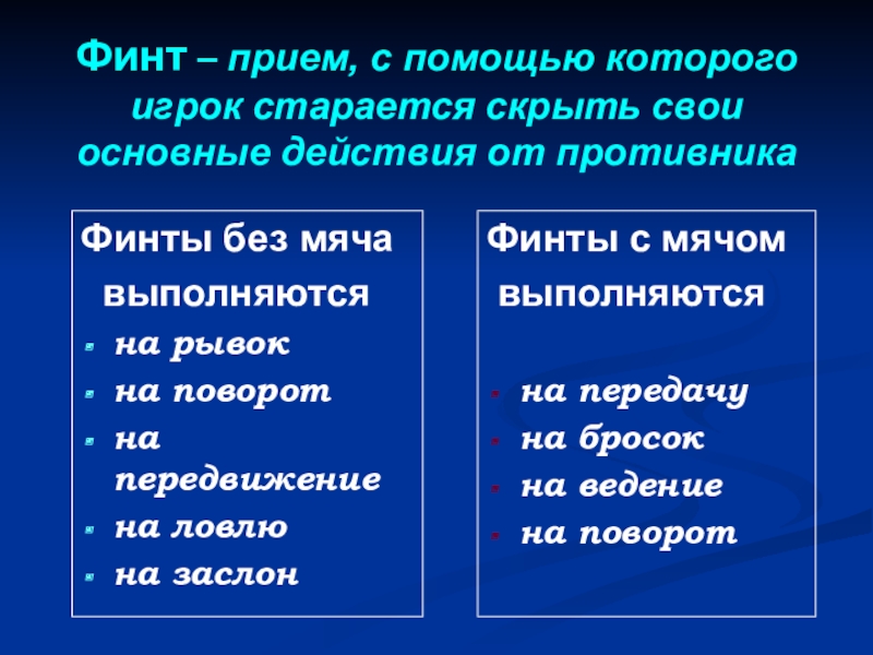 Слайд 7Финт – прием, с помощью которого игрок старается скрыть свои основные