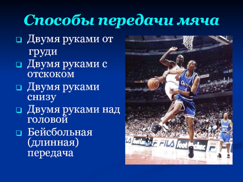 Способы передачи мячаДвумя руками от   грудиДвумя руками с отскокомДвумя руками снизуДвумя руками над головойБейсбольная (длинная)