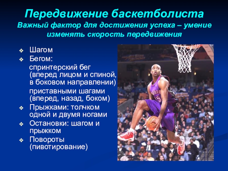 Слайд 5Передвижение баскетболиста Важный фактор для достижения успеха – умение изменять скорость передвижения
