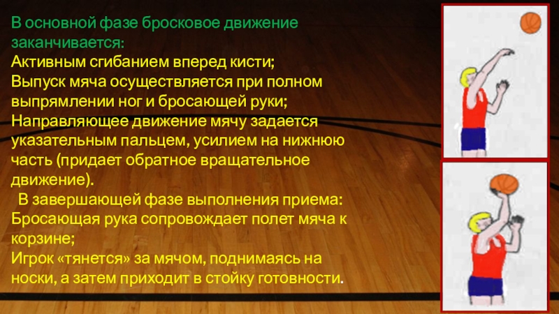 как обе руки будут выпрямлены, правой рукой толкаем мяч вверх, направляя его в щит 30см. над корзиной