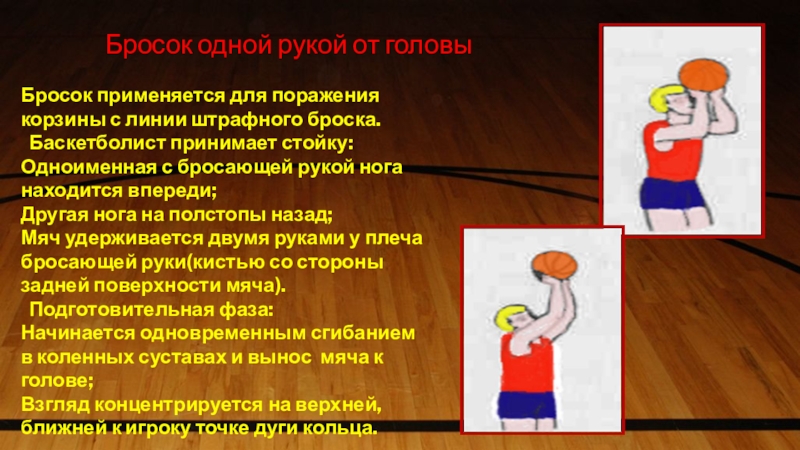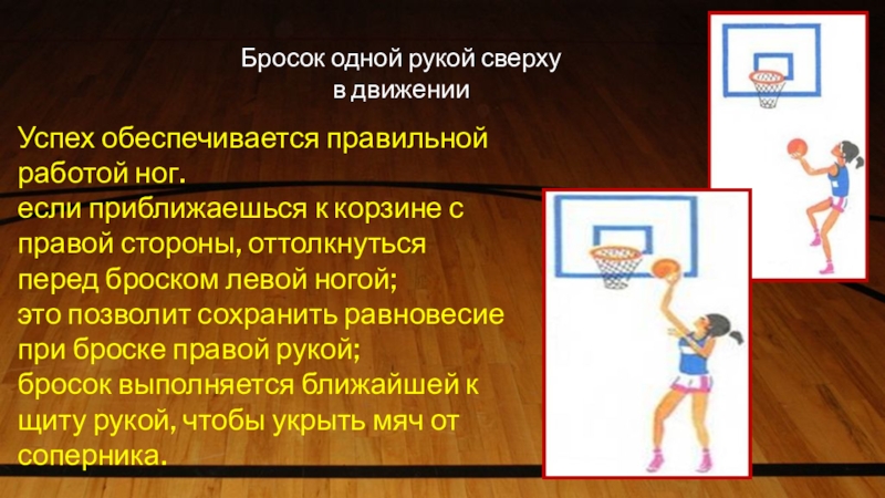 к корзине с правой стороны, оттолкнуться перед броском левой ногой;
