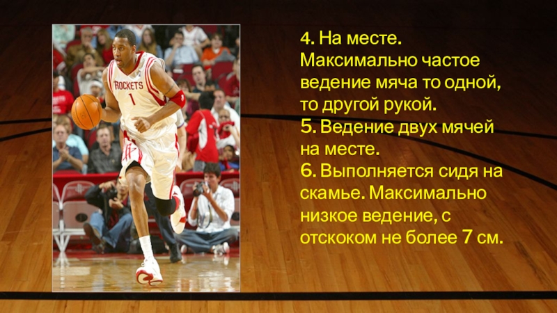 6. Выполняется сидя на скамье. Максимально низкое ведение, с отскоком не более 7 см.